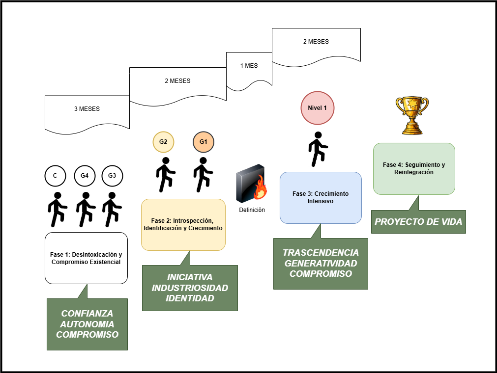 - Objetivo: Consolidar los avances logrados en la fase anterior mediante un desarrollo constante de las capacidades del carácter. Esta fase incluye actividades terapéuticas intensivas y la aplicación práctica de hábitos positivos.
